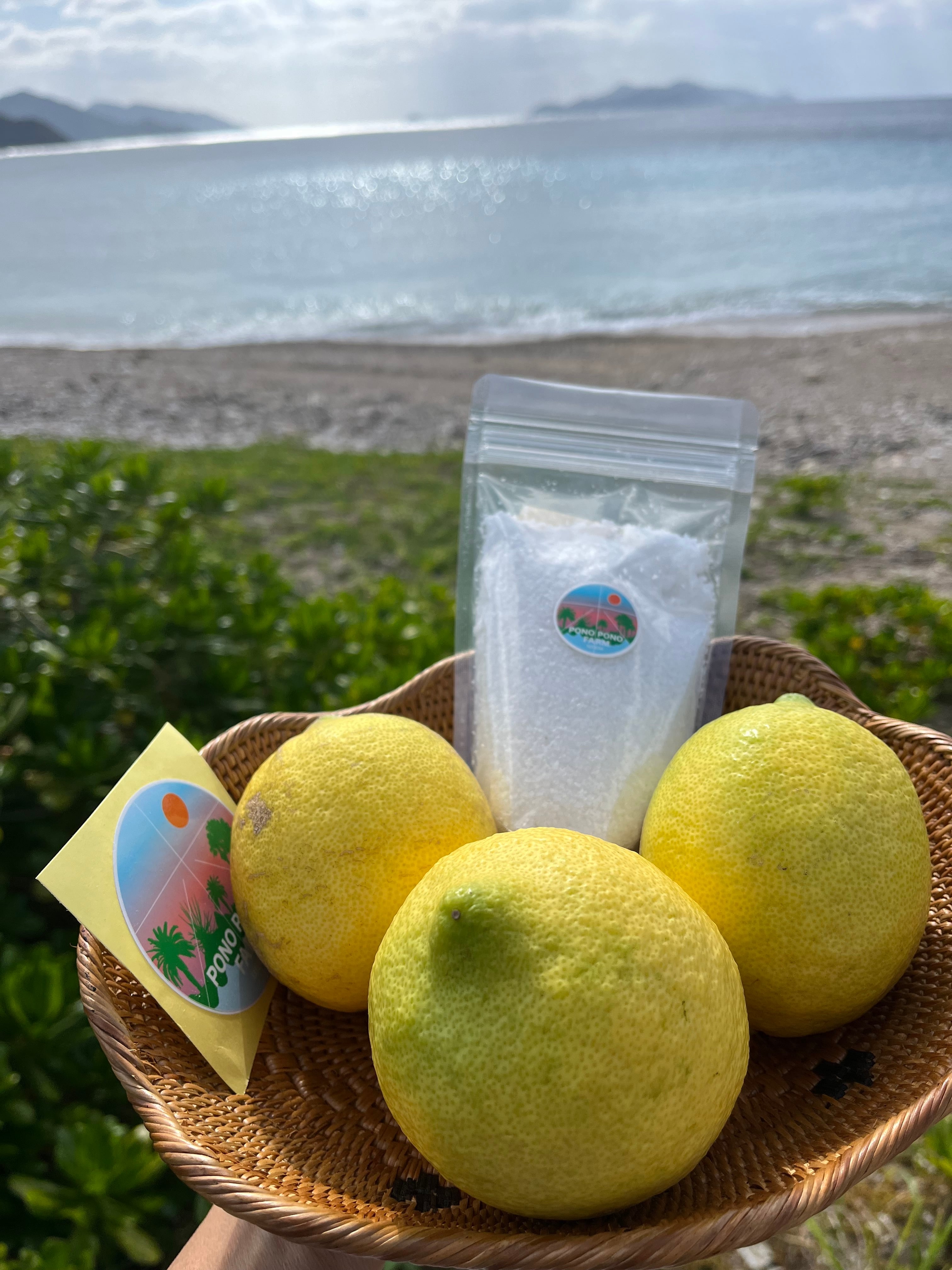 ⭐︎レモン、ひと玉300グラム前後ある果汁たっぷりの大玉を選別します。傷、スレ、あるものもあります。レモン3玉と、クサンバの塩200グラムのセットです。